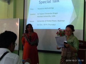 Events | October 16, 2019 Special Talk Title: Research Methodology Speaker: Dr. Yojana Charandas Bhagat, Mumbai University, India Venue: University of Global Peace, Myanmar Date: 3th Oct, 2019 (Thursday) UGP Special Talk Special Lecture Given by Dr Jotika